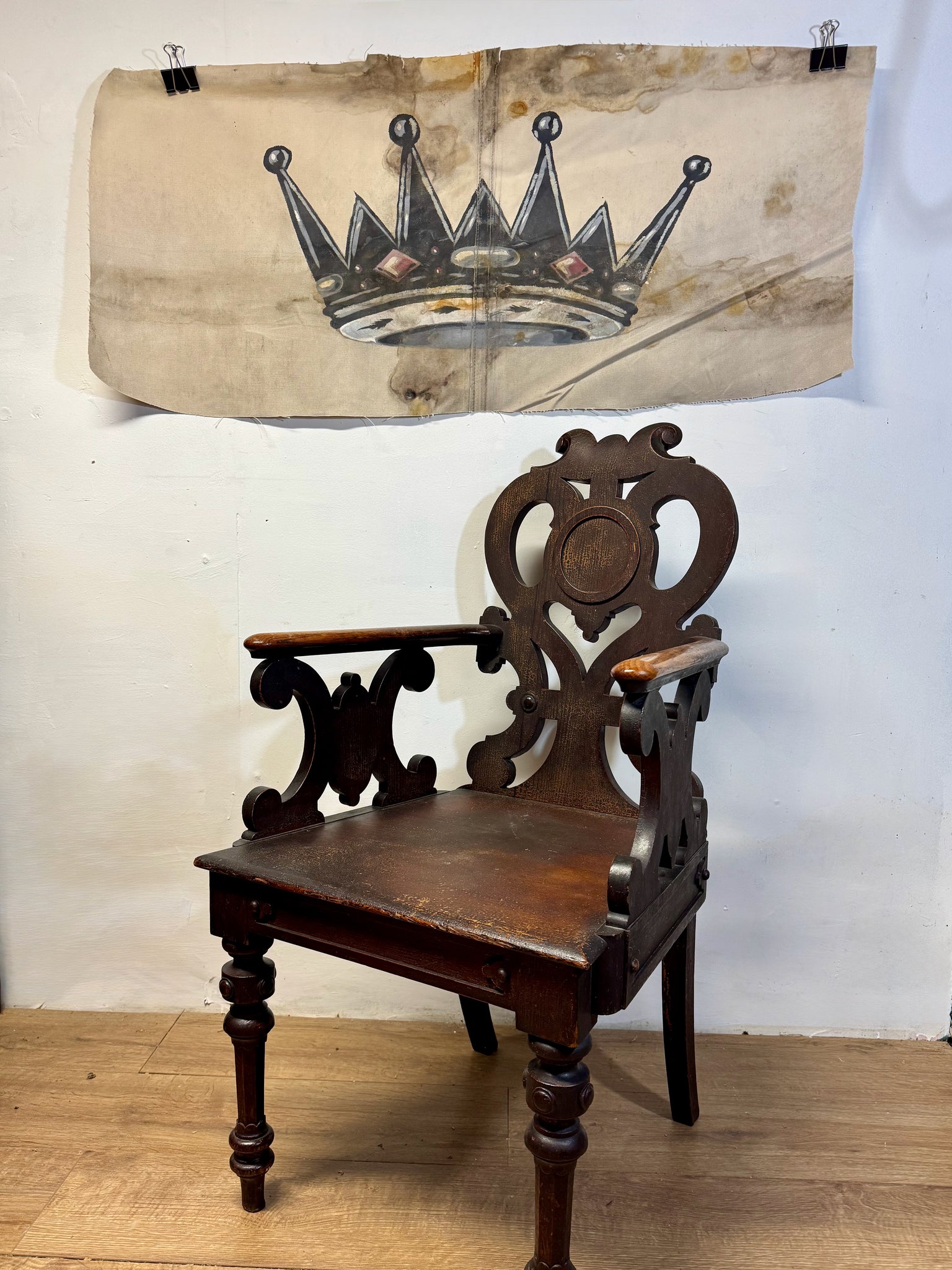 A rare and unusual late Victorian hand painted shop banner on canvas, made for a West Country jeweller in Sidmouth, Devon. The section banner is painted with a bold crown motif, the jewels picked out in red against black lining, the canvas showing the wear and patina expected of a working trade sign left in storage for many years. The crown appears to have been cut and retained from a larger banner. Hand painted canvas banners of this type seldom survive, as they were functional objects exposed to use and weather, and often discarded when shops modernised.